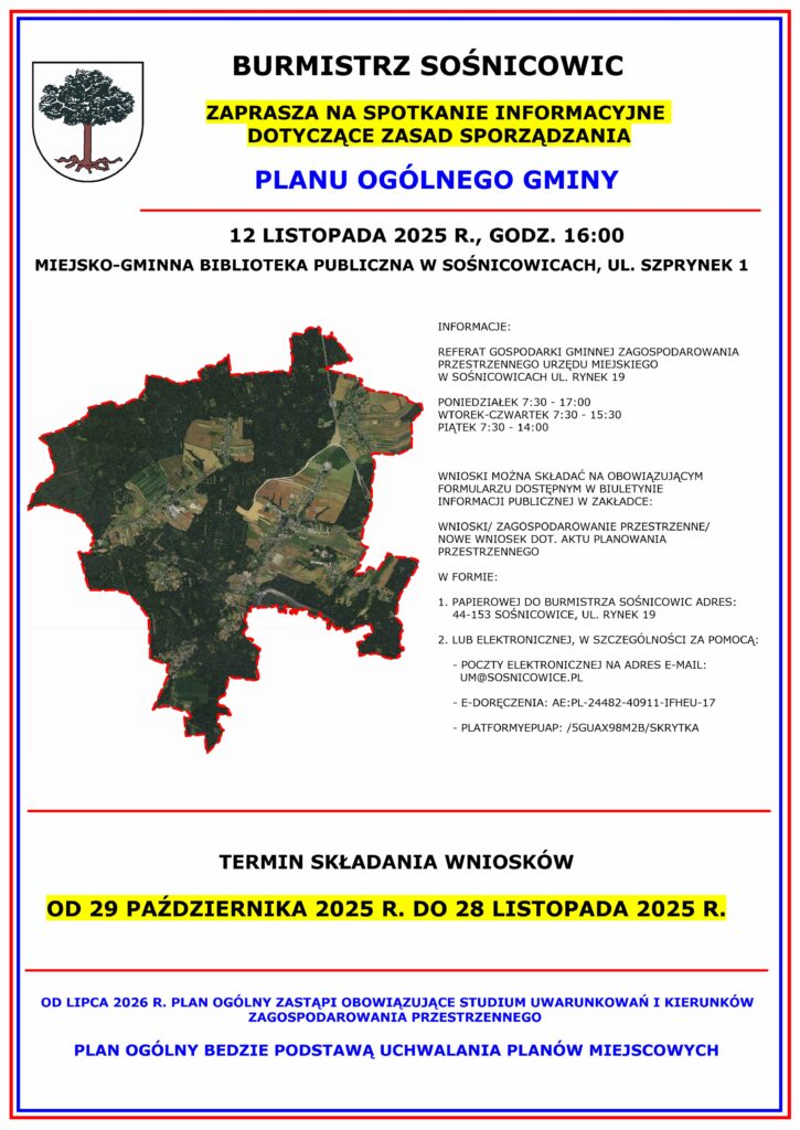 Spotkanie w sprawie przygotowania planu odbędzie się 12 listopada 2025 r. o godz. 16:00 w Miejsko-Gminnej Bibliotece Publicznej w Sośnicowicach, ul. Szprynek 1.