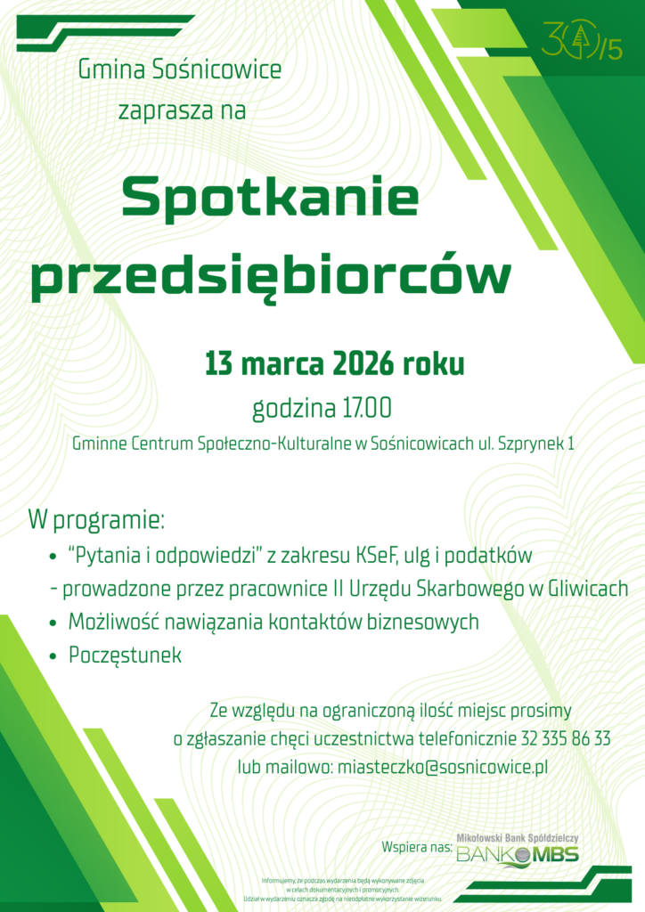 Gmina Sośnicowice zaprasza na Spotkanie Przedsiębiorców, które odbędzie się: