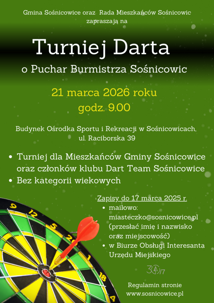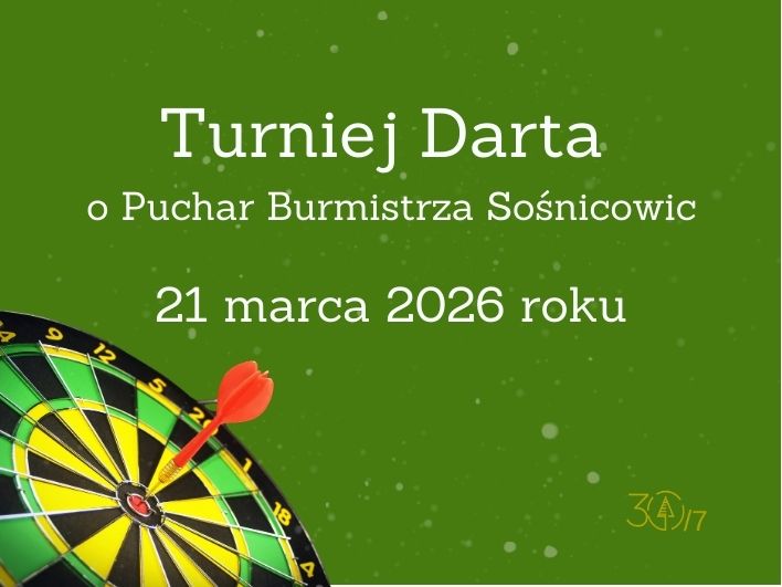 Gmina Sośnicowice oraz Rada Mieszkańców Sośnicowic zapraszają do udziału w Turnieju Darta o Puchar Burmistrza Sośnicowic, który odbędzie się: